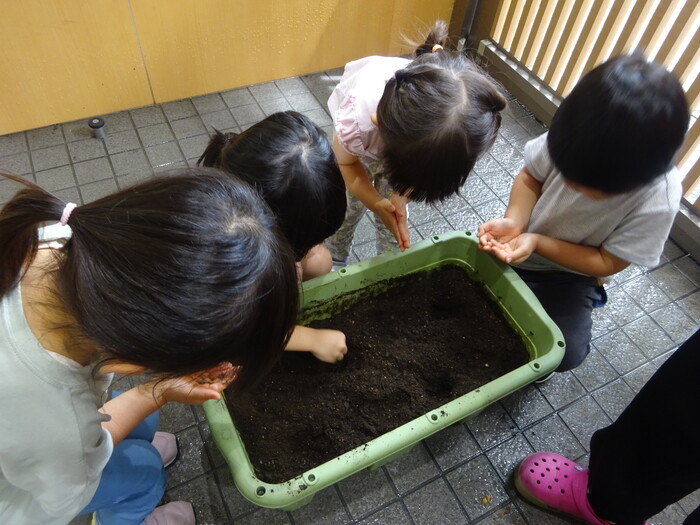 ゆっくりと土をかぶせてあげる子ども達😊
